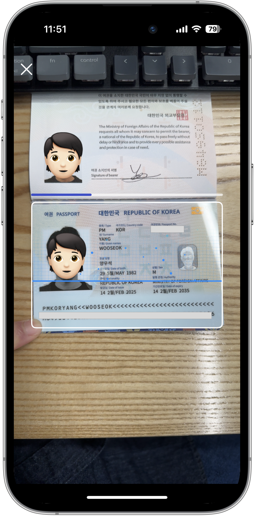 여권 정보를 Live OCR로 습득하고 전자여권(NFC 활용) 검증으로 위조 및 소지 여부를 판단하며, 여권 원본 사진과 FACE MATCHING을 통하여 본인 확인 후 Liveness를 수행하여 여권을 검증합니다.
