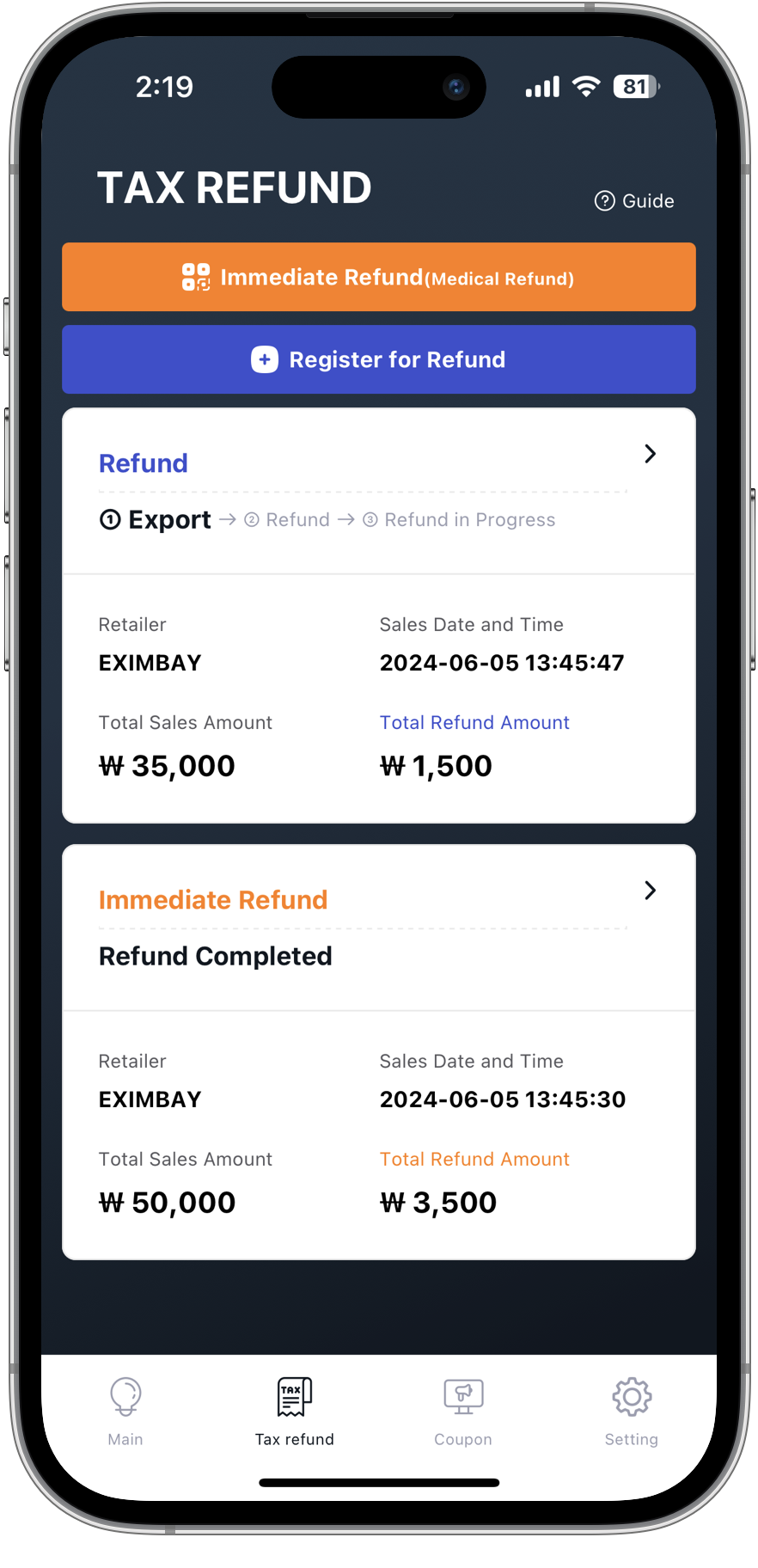 여권 정보로 사후 환급 (모바일 반출, 환급)을 제공합니다.